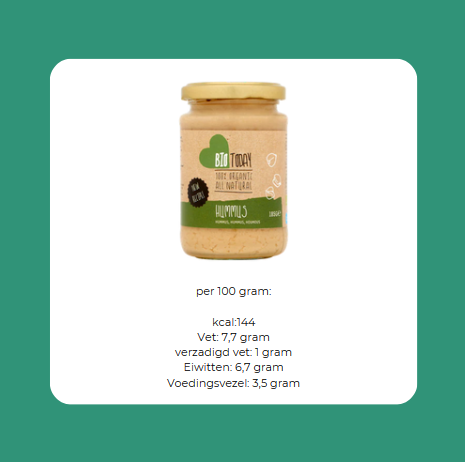 Uiteraard kun je ook andere merken bekijken. Bijvoorbeeld deze van Bio Today. Verrassend een stuk lager in hoeveelheid vet en kilocalorieën. In plaats van zonnebloemolie is hier gebruik gemaakt van olijfolie. En staat olijfolie als laatste ingrediënt vermeld, wat betekent dat hiervan het minste in zit. Helaas wel wat lager in eiwitten en voedingsvezels. Verder is als enige E-nummer “citroenzuur” gebruikt. Een goede optie wat mij betreft!